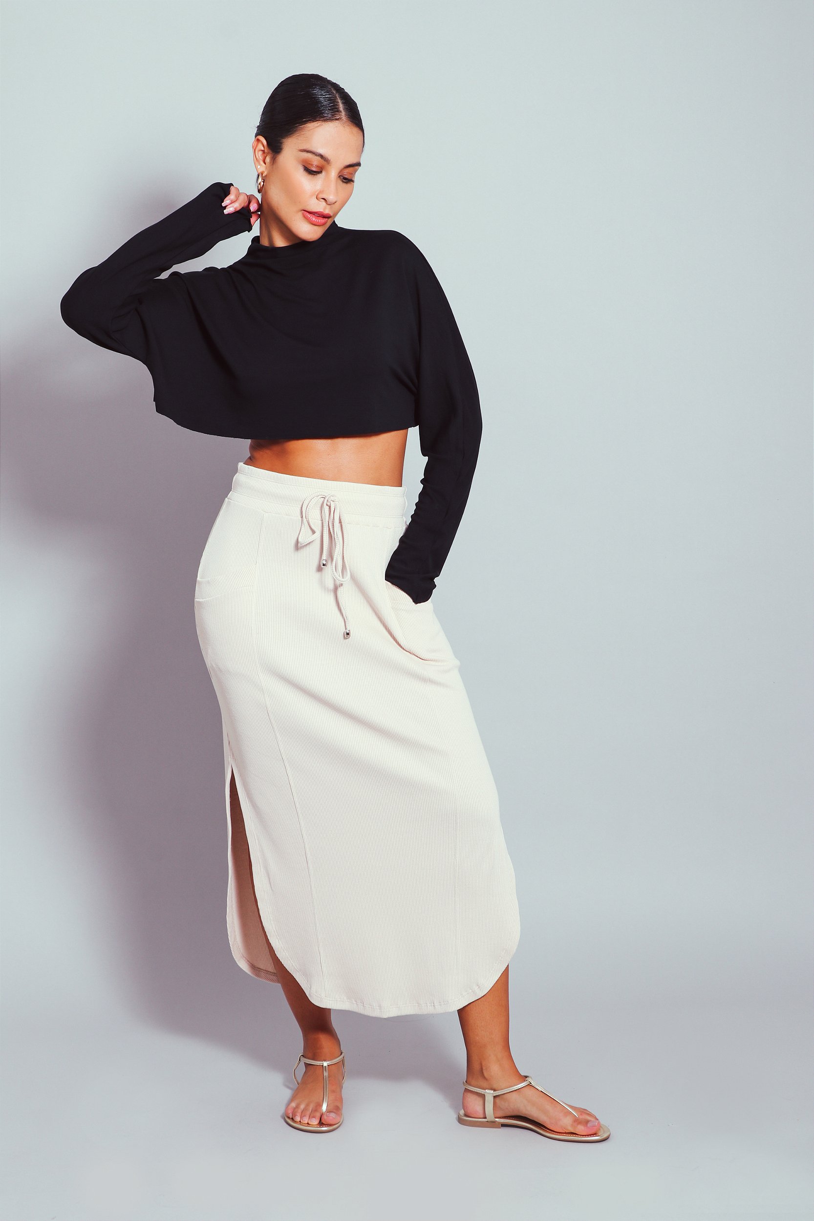 Os bolsos laterais adicionam um elemento funcional, permitindo que você carregue pequenos itens com facilidade, sem abrir mão da elegância. Com um corte midi, essa saia é versátil o suficiente para ser combinada com camisetas, blusas cropped ou suéteres, criando looks descontraídos ou mais sofisticados.
